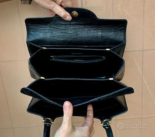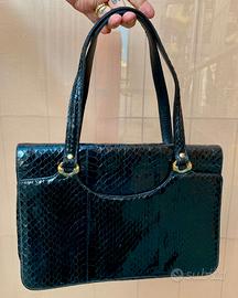 Raffinata borsa a mano strutturata realizzata in pregiata pelle esotica di pitone (o elaphe) con finitura lucida. Un accessorio che incarna l'eleganza classica del dopoguerra, caratterizzato da una lavorazione artigianale che esalta la texture naturale delle squame. Dettagli Tecnici: Materiale: Vera pelle di rettile (Pitone/Elaphe). Le squame presentano la tipica forma a diamante nella parte centrale e una grana più fitta sui bordi. Modello: Handbag con pattina superiore (Top Flap). Design: Linea rettangolare pulita con inserti hardware in metallo dorato. Chiusura: Pattina sagomata a semicerchio con chiusura magnetica o a incastro (verificare il meccanismo interno). Manici: Doppio manico lungo in pelle coordinata, fissato tramite eleganti ponticelli metallici dorati a forma di "U". Interno: Ampio scomparto unico, ideale per l'uso quotidiano o serale. Colore: Nero profondo con finitura gloss. Stato di conservazione: L'oggetto è in buone condizioni vintage. Trattandosi di un pezzo d'epoca, si segnalano: Pelle: Ben conservata, con squame integre e lucide. Lieve e naturale sollevamento di alcune squame dovuto al tempo (caratteristico della pelle di pitone autentica). Hardware: Metallo dorato con lievi segni di ossidazione coerenti con l'età.