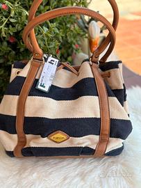 Realizzata in tessuto robusto a righe larghe color blu e beige, con dettagli e manici in eco-pelle.