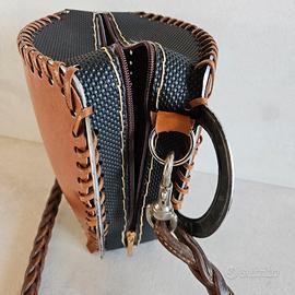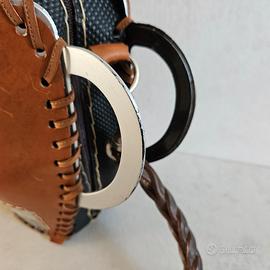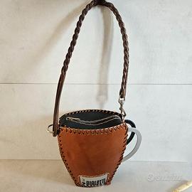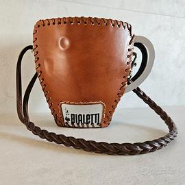 Borsa a secchiello con tracolla, in cuoio vera pelle. Pezzo unico. Realizzata a mano in un piccolo laboratorio artigianale, con elementi unici originali Bialetti. Nuova e mai usata.