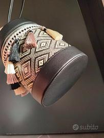 Particolare borsa a cilindro Carpisa in pelle vegana, con nappine decorative in raso panna/nero fantasia etnica. Tracolla regolabile. Nuova, mai indossata.