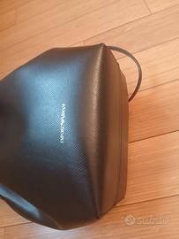 Borsa a secchiello a tracolla Emporio Armani in pelle martellata nera ed interno in pelle bordeaux . Pochette per documenti e dustbag originale . No graffi ne’ segni di usura - usata 1 volta. Misure base cm 20 x cm 11 - h cm 26