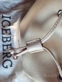 Vendo borsa a tracolla secchiello - Iceberg - pelle martellata - tracolla in pelle liscia all'esterno e martellata all'interno - modello vintage - chiusura con coulisse arricciata - cinturino di riserva - fibbia con nome del brand - parti metalliche tra cui il logo del brand - taschino interno con zip - interno foderato - vera pelle - colore bianco - tacchetti di protezione sulla base - altezza cm 30 circa - base cm 25x15 - tracolla regolabile cm 100 circa - con custodia antipolvere - pari al nuovo - made in Italy .