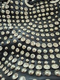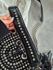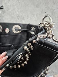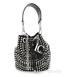 Borsa a secchiello in eco pelle di La Carrie con bottone magnetico di chiusura. Borchie applicate. Tracolla inclusa. Misure 25 x 26 cm. Dettagli silver, borchie e diamantini. Nuova mai indossata, da quando mi è stata regalata è rimasta nel suo dust bag ma ha comunque dei segni sul bordo della pelle evidentemente dovuti al tempo