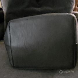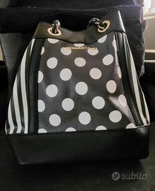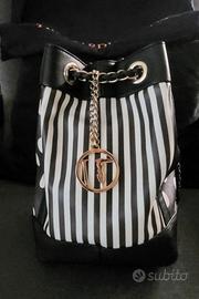 Design a secchiello morbido, o bucket bag, per la borsa Trussardi originale in similpelle liscia, versione medium. Singolare è il bicolore, bianco e nero, il look è impreziosito dal motivo a multistampa. E’ dotato di tracolla, che facilita la chiusura, ed è utilizzabile a catena singola o doppia. E’ presente anche un bottone magnetico a scatto per una maggiore sicurezza nella chiusura. Un accessorio versatile e casual. Pagata euro 260,00 e mai utilizzata. Misure: h. cm 30 x lung. cm 20 x largh. Cm 30