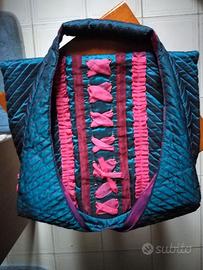 Utilizzata una volta notare il nastro sul davanti Secondo me presenta un difetto, Ma io l'ho comprata così la marca è Luna Lena, ma all'interno della borsa non c'è un'etichetta Chiusura con bottone magnetico fodera interna metallizzata fucsia cangiante larghezza 36 cm Lunghezza 34 cm lunghezza manico 43 cm