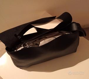 Vendo borsa da donna a spalla in semilpelle nera con comoda tracolla regolabile, interno spazioso con taschino porta cellulare, patta davanti.