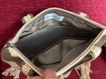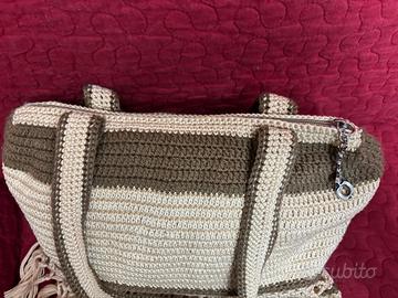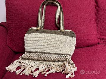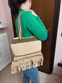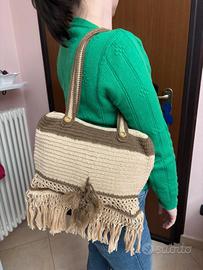 Borsa interamente fatto a mano. Rivestita internamente in tessuto. Con tre tasche interne da un lato, una grande dall'altro. In cotone grosso e tessuto interno. Chiusura con cerniera. Doppia Tracolla. Non usata e immacolata. Dimensioni: base 11 x 28circa, altezza 20cm circa.