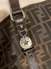 Borsa a spalla originale FENDI con tracolla. Molto capiente. Un po’ usurati i manici in pelle per l’uso. La tracolla mai usata e’ in perfette condizioni. Anche il tessuto della borsa andrebbe lavato a secco per renderlo un po piu pulito dato che e’ stata usata.