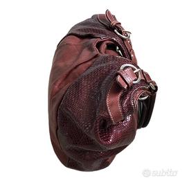 Borsa a spalla Gattinoni La borsa è : - Originale - Pelle - Usata La borsa è in buone condizioni generali, i manici sono usurati e scuriti dall'uso, sul lato anteriore e posteriore della borsa sono presenti macchie oltre che sul fondo. Dimensioni : H. 25 cm Lungh. 35 cm Largh. 8 cm