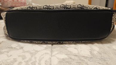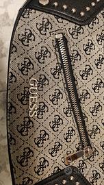 Splendida borsa a spalla firmata Guess, modello Frankie. Caratterizzata dall'iconico tessuto jacquard con logo all-over nei toni del grigio e del nero, arricchita da grintosi dettagli in ecopelle nera e borchie argentate.