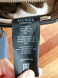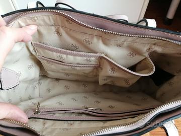 Borsa a spalla Guess rigida, a forma di barchetta, con manici e fiocco, color rosa antico e beige molto chiaro, taschino esterno e tasche interne.