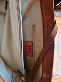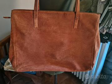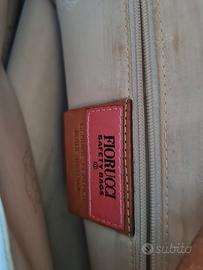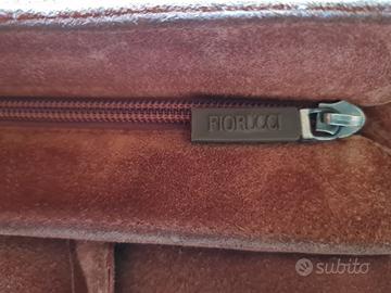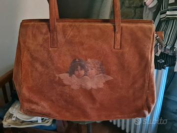 Borsa a spalla, in camoscio, marca Diorucci. Bella ampia, con cerniera interna, che crea tre scomparti,più taschino con cerniera. Presenta un disegno sul davanti con due angeli. Chiusura a cerniera con gancio a cursore scritta Fiorucci. È usata ma non presenta segni di usura.