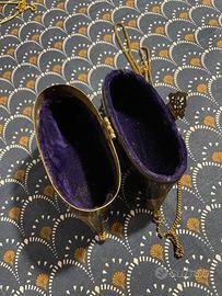 Bellissima borsa a cuscino rigida nera e oro con lunga catena da portare a spalla. L'interno in velluto viola.