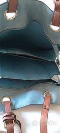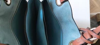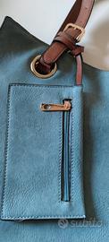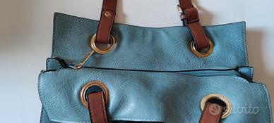 Borsa in pelle color celeste con manici a spalla color cuoio. Perfetta per la primavera e l'estate. È dotata di un comodo borsellino interno rettangolare che si può estrarre grazie al cinturino della stessa pelle della tracolla. Comode le dimensioni anche per PC portatile/tablet e le numerose sezioni e tasche interne. H cm 37 + manici, larghezza cm 35. Nuova mai usata