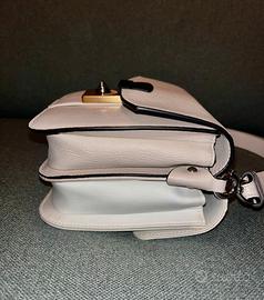 New Lock presenta un design color-block, in questo caso beige e bianco. Chiusura a girello frontale. Include sia una tracolla regolabile e rimovibile, che un manico a catena.