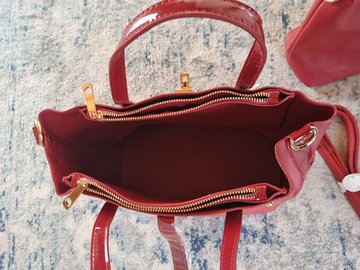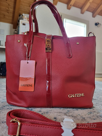 Borsa a spalla marchio Galtzine con tracolla removibile rossa in ecopelle, profili in vernice e dettagli dorati.