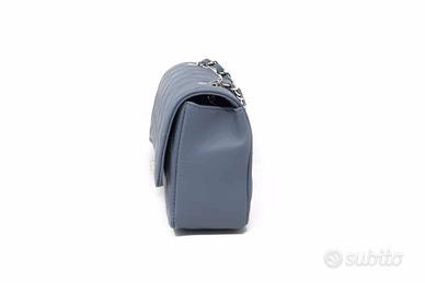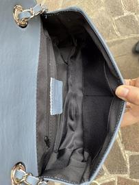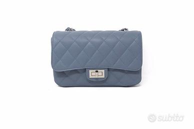 STUPENDA BORSA A SPALLA AZZURRO AVIO IN VERA PELLE CREATA DA MAESTRI ARTIGIANI MADE IN ITALY TRAPUNTATA CATENA INTRECCIATA ORO E PELLE MOLTO CAPIENTE 29x20 lato 9 INTERNI IN TESSUTO NERO CON TASCHE.