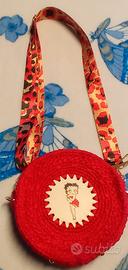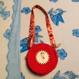 borsa a tracolla fatta a mano, materiale cotone,laterali con disegno su legno,interno foderato.Diametro borsa 20cm.