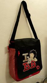 Borsa a tracolla nera con dettagli rossi e bianchi in tela con motivi a pois rossi