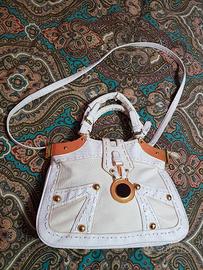 Borsa a tracolla, colore bianco, con inserti in metallo colore oro, dentro maculata. Usata, ma in buonissimi condizioni, presenti piccoli segni d'uso sul metallo, poco visibili.