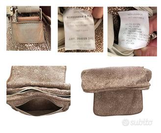La borsa presenta macchie sulla tracolla, sui tiralampi della cerniere della tasca esterna ed interna, sui lati dove è presente la pelle che tiene la fibbia della tracolla.