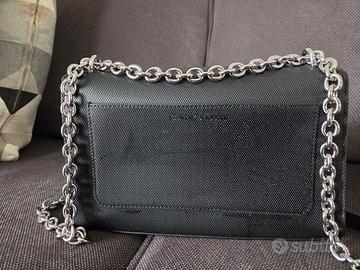 Dimensioni 25 cm x 15 cm x 6 cm Usata pochissimo perché non amo tracolla con catena. Vendo per inutilizzo.