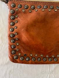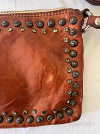 In pelle marrone e strass. Se n'è staccato uno e vi è un piccola macchia sulla parte frontale (Vedi foto).