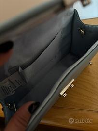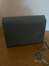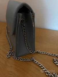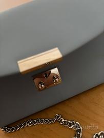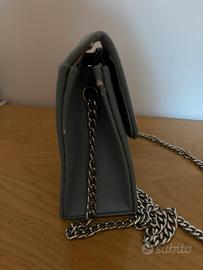 Tracolla lunga in metallo argentato, chiusura con meccanismo a scatto, materiale semirigido
