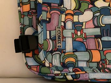 Borsa a tracolla Comix Messenger multicolor estensibile in profondità, cinghia colore nero regolabile da cm 100 a cm 145 con rinforzo per spalla, chiusura principale con moschettoni in materiale plastico, due scomparti a tasca, una tasca supplementare interna con chiusura zip lunghezza cm 20, una tasca supplementare esterna con chiusura zip lunghezza cm 33, altezza cm 20, dimensioni cm 38 lunghezza X cm 30 altezza X cm 8 profondità (estensibile a cm 18 con zip), etichetta e tirazip in metallo cromato con logo forato e inciso, materiale poliestere ad alta densità