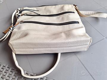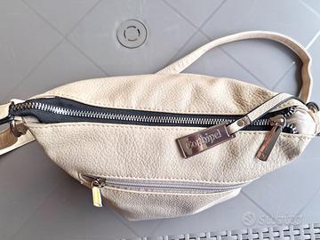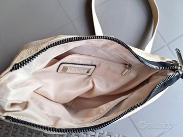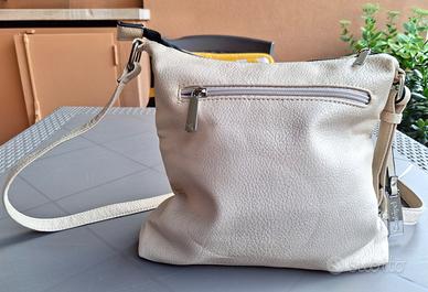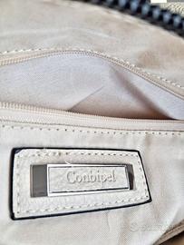 Vendo borsetta a tracolla da donna Conbipel originale, usata ma ben tenuta. Dispone di 2 tasche esterne (di cui una solo estetica) sul davanti e una sul retro. Ha un taschino interno con cerniera e due tasche porta-cellulare. La tracolla è regolabile per una lunghezza massima di 120 cm. Ecopelle, colore panna. Misure: 28 cm (largh.) x 27 cm (h) x 7 cm (profondità).