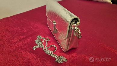 Borsa a tracolla e a mano color oro con catenella allungabile, misure cm 21,5 x 14 x 8,5, uno scomparto interno con cerniera e uno senza, chiusura totale della borsa con cerniera e click a bottone, tenuta in eccellenti condizioni, solo un leggero taglietto quasi invisibile sul lato sinistro della chiusura frontale, vendo euro 10,00. Consegna gratuita a mani sull'asse Ivrea-Torino