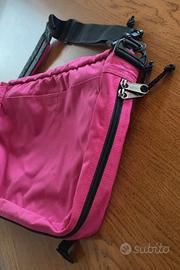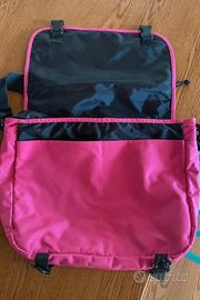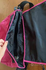 Borsa a tracolla Eastpak fucsia, utilizzata due volte, praticamente nuova. Super capiente, presenta uno scomparto principale richiudibile con zip, una tasca a scomparsa sulla patta, una grande tasca sul retro e due tasche minori internamente. Possibilità di aumentarne le dimensioni grazie alla zip esterna. Altezza: 30.5 cm, Larghezza: 38.5 cm, Profondità: 13 cm