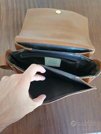 Elegante borsa a tracolla firmata Francesco Biasia, realizzata in vera pelle color cuoio. Modello vintage con chiusura a patta, fibbia dorata, tracolla regolabile e interno ben organizzato con tasche e zip.