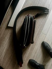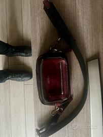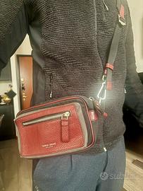 Borsa a tracolla uomo Giorgio Armani – Elegante e raffinata, realizzata in pelle martellata rosso scuro con dettagli in suede marrone. Presenta una tasca frontale con zip, tracolla regolabile e finiture di alta qualità.