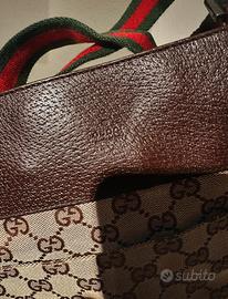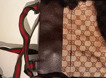 Borsa a tracolla Gucci, tessuto GG supreme beige e tracolla verde e rossa, regolabile in lunghezza. Ha due tasche esterne, su entrambi e lati. Zip centrale e zip interna con altra tasca. Usata ma in ottime condizioni. Ha due piccoli segni sulla parte in pelle di un lato (ultima foto).