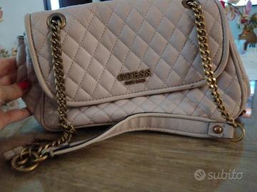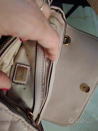 Borsa a tracolla guess originale usata, in buone condizioni generali. Presenta ammaccatura dietro intorno alla cerniera visibile in foto( vedi foto n 4).Il difetto è di lieve entità e non ne compromette la funzionalità. Cerniere funzionanti sia all'esterno che all'interno della borsa.