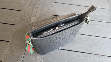 Borsa a tracolla in ecopelle e tessuto con tracolla, chiusura della parte esterna della borsa con clip magnetico, chiusura dell’interno della borsa con zip. All'interno 3 tasche: 2 piccole ed una più grande con zip. All'esterno (dietro) un’altra tasca