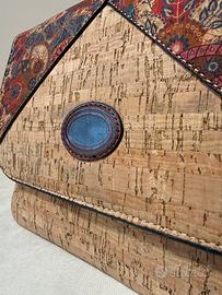 Vendo borsa a tracolla realizzata in sughero. Il design è arricchito da un inserto a contrasto con fantasia floreale sui toni del bordeaux e del blu.