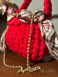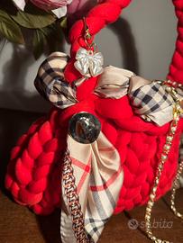 Borsa a tracolla intrecciata a mano in filato grosso di cotone. Colore rosso. Foderata. Impreziosita da charmes ( con possibilità di personalizzazzione), dotata di catena color oro e perle. Altezza 36cm, larghezza 28cm. 🎀NUOVA CON CARTELLINO🎀