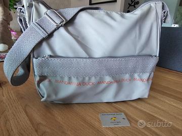 Borsa a tracolla Mandarina Duck in colore grigio chiaro, dal design moderno e funzionale. Realizzata in materiale resistente e impermeabile, è dotata di una comoda tracolla regolabile e una tasca frontale con zip. Il logo “Mandarina Duck” è stampato sulla parte frontale in rosso. Usata ma in ottime condizioni, senza difetti evidenti.