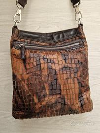Borsa a tracolla in pelle effetto vintage, marrone chiaro e scuro a scacchi. Marchio Orciani.
