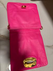 Borsa Miu Miu misure 21 x 21 cm circa ,colore rosa acceso di pelle :modello piatto, fornita con due tracolle intercambiali tramite ganci laterali ,dettagli dorati usata poco,nessun difetto visibile, scomparti interni e tasca con zip .Abbastanza capiente perché si allarga un poco e gli scomparti permettono di tenere gli oggetti in ordine.Adatta a ragazze giovani per una serata,anche in discoteca o ad un concerto per via della tracolla e essendo piatta occupa poco spazio: da infilare in valigia é perfetta!