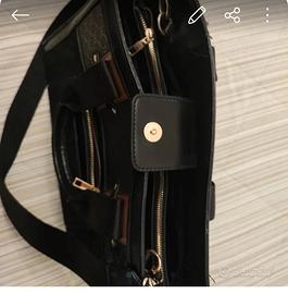 la borsa è stata usata poche volte pertanto non presenta screpolature , è molto spaziosa, internamente ha una tasca centrale spaziosa con cerniera,la chiusura è con un bottone calamitato, dotata di due tracolle, una nera e una bianca e nera