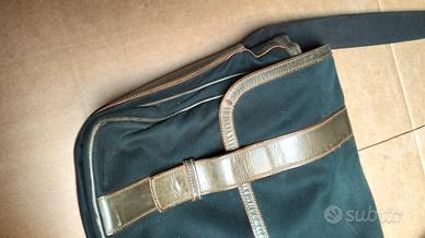borsa a tracolla prototipo disegnato e realizzato da un artigiano milanese, oggi non più attivo, materiali : Canvas cotone robusto colore nero con finiture in cuoio colore naturale, tasche interne, di cui una con alloggiamento penne e matite. Misure 40 x 30 x 10