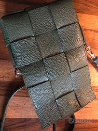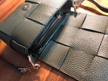 Borsa mini a tracolla, realizzata con maxi fettucce intrecciate double-face in pelle color verde militare. Caratterizzata da metalleria color oro, chiusura con bottone magnetico su patta e tracolla regolabile. L'interno tono su tono è dotato di bustina, per carte, con cerniera, staccabile.