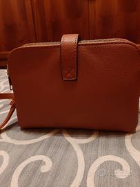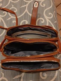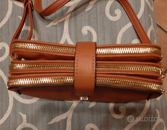 Borsa similpelle, trama martellata, da portare a tracolla, colore marrone aranciato, ha 3 tasche differenti che si chiudono con la cerniera. Ha poi un laccetto che si fissa sul davanti della borsa per donargli un aspetto più particolare e elegante. MAI UTILIZZATA poiché ho sbagliato la misura nell'acquistarla