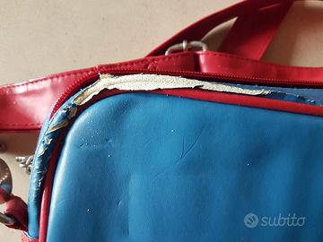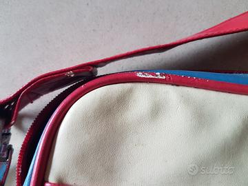 Borsa a tracolla o custodia per laptop imbottita ufficiale a marchio Vespa, caratterizzata dai colori blu, rosso e crema con la scritta "The World's Finest Scooter".