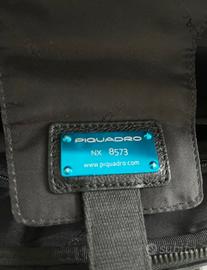 Borsa con tracolla da uomo della Piquadro, in pelle nera e piccoli dettagli interni blu. Ideale per ufficio. Interni con svariate tasche, 3 tasche esterne molto capienti.