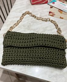Borsa a tracolla realizzata a mano all’uncinetto. Chiusura interna con tre bottoni a calamita. Tracolla plastificata anti usura. Colore verde
