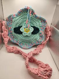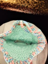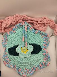 Borsa artigianale all’uncinetto in fettuccia, pezzo unico fatto a mano, perfetta per aggiungere un tocco originale e colorato ai tuoi outfit casual.